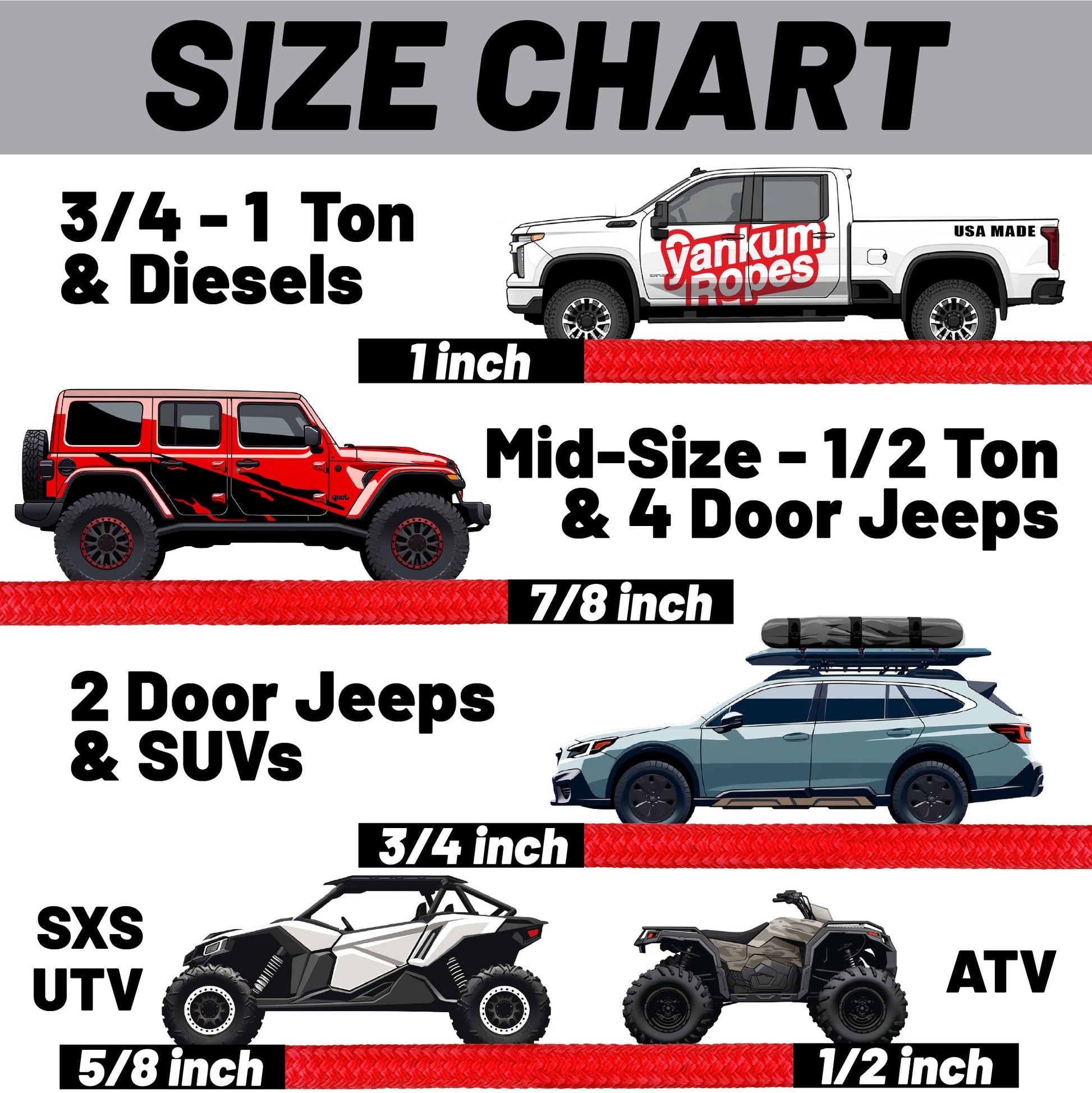 Ropes are rated based on the weight of the vehicle doing the recovery, not the vehicle that's stuck. Taking your 1 ton truck to the rescue? You need this 1" rope.