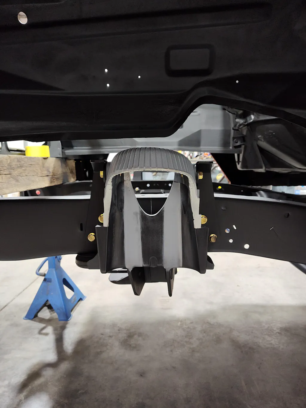 Install this kit by first cutting all old bracketry out of the way. Also pop out the factory assembly/alignment pins from the CV crossmember. Then place the crown Vic suspension under your frame and check wheel/fender alignment. Once you are happy with wheel placement, make sure it is centered and square, then mark the 5/8” holes in the frame rail. We recommend drilling to ¾” to have some wiggle room. Now install the crossmember, inserting the inner frame brace in place. Push it tight against the inside of the frame and tighten the mounting bolts. You can now use the bracket as a template to drill 4x 1/2” holes in the vertical web of the frame rail to bolt the upper brackets in place. Use the M10 bolts and nuts to attach them to the frame, and the M12 bolts to attach to the CV crossmember. Once the crossmember is installed, bolt the rear mounts to the control arm and use them as a template to drill ½” holes in the frame rails for the M12 mounting bolts. Install using the M12 fasteners and nuts, Use 2 shims per side to set your caster.