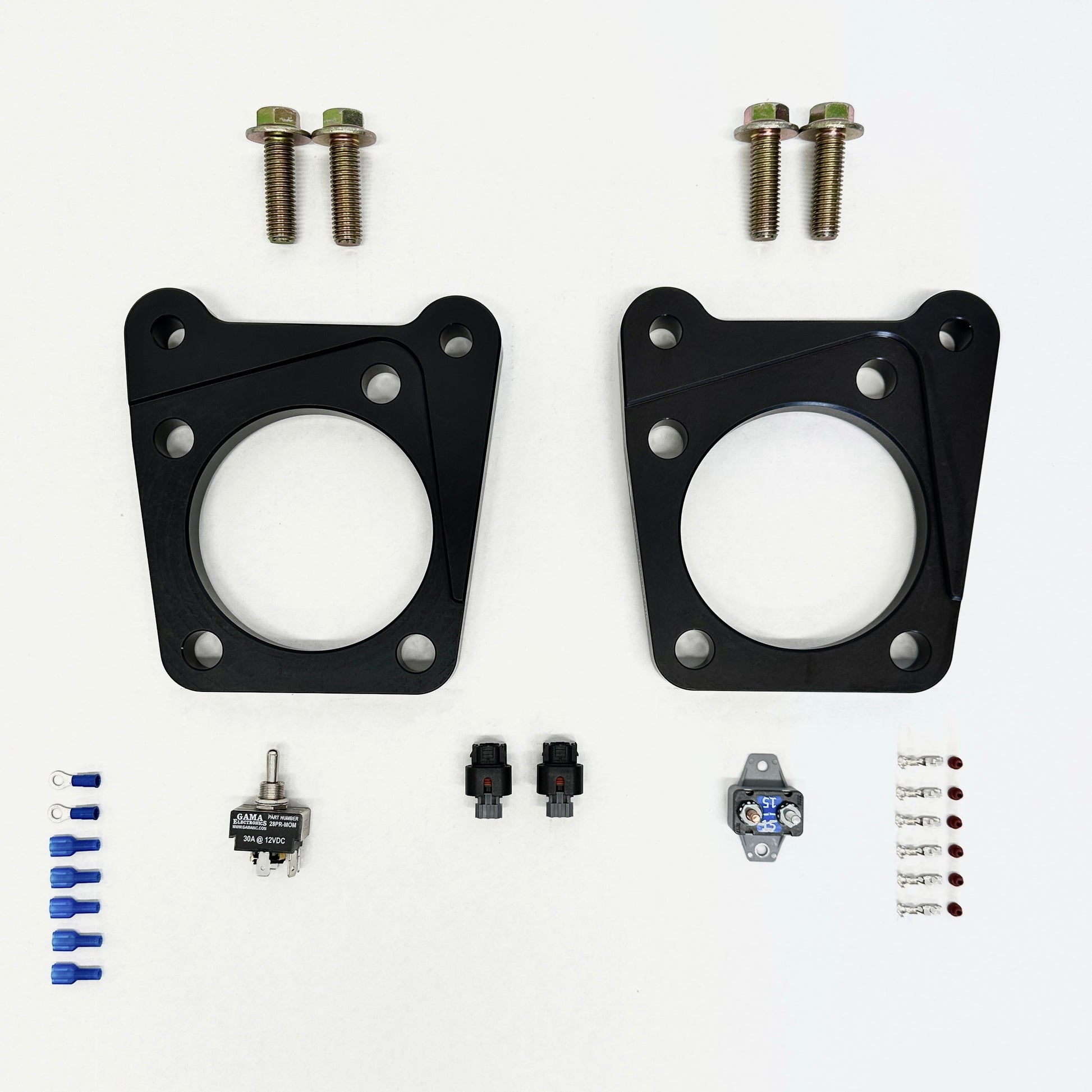 The kit comes with the caliper adapters and rotors, as well as the connectors, control switch, and breaker required to operate the parking brakes. You will need to supply your own calipers from a late model GM vehicle: