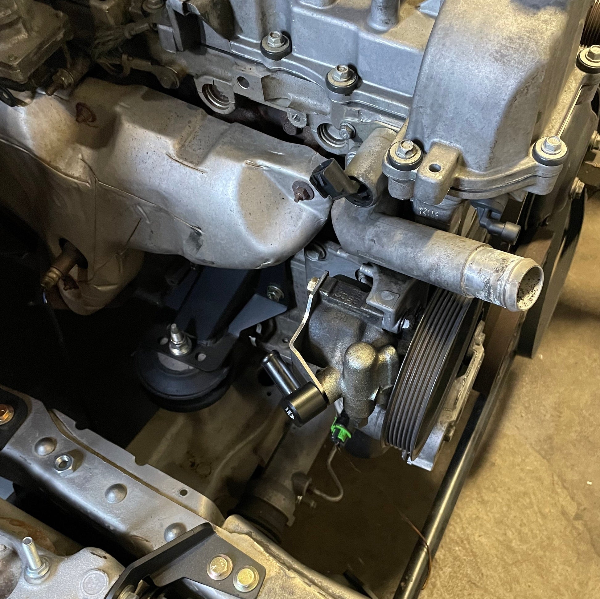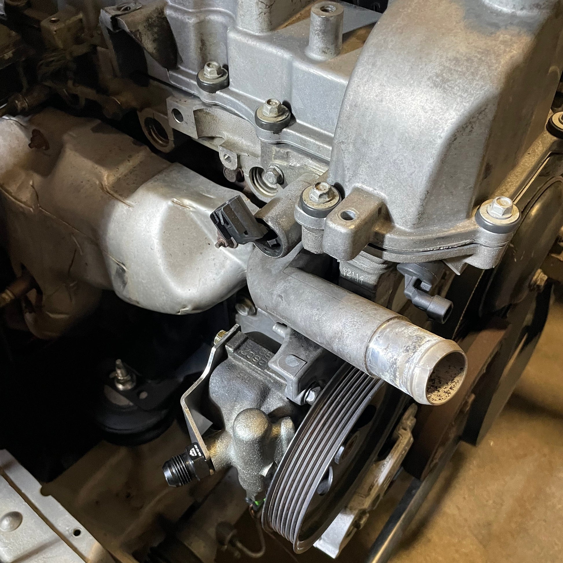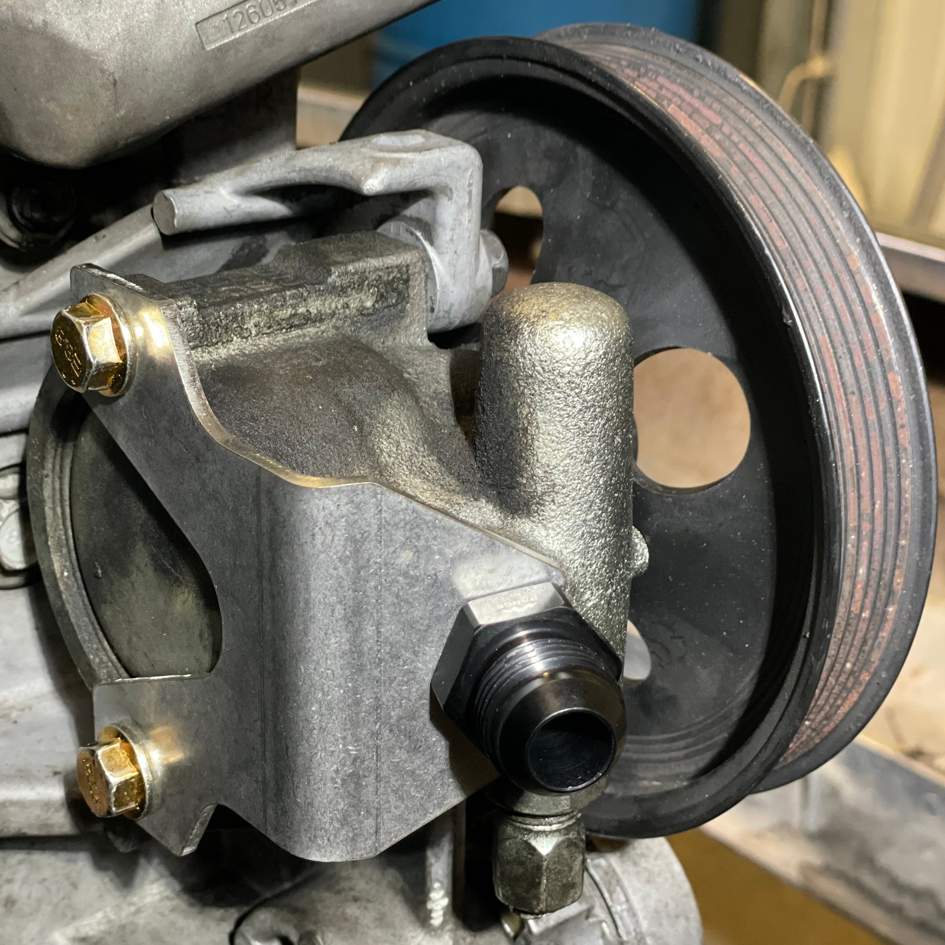 The power steering reservoir sticks waaay out on these engines... make some room in those narrow engine bays or get some clearance for your turbo and piping. Remove the stock reservoir and bolt this on to the pump to plumb in a remote one. The port on the pump is not threaded, so you need this special fitting with retention plate.